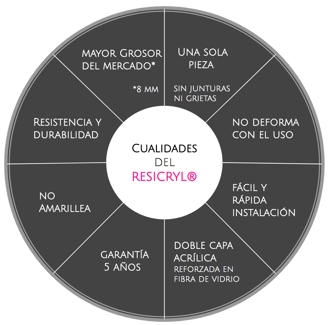 •  Resicryl®: material compuesto de dos capas de acrílico de 4mm o una capa de 10mm, de alta calidad y reforzamiento con fibra de vidrio lo que le confiere una gran dureza y una resistencia a toda prueba. Además este material permite una elaboración perfecta, obtener curvas netas y bordes muy finos. Espesor total de la pared: entre 2 cm y 3 cm según las zonas y sus necesidades de resistencia a las cargas y presiones.