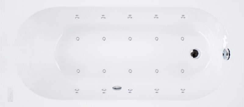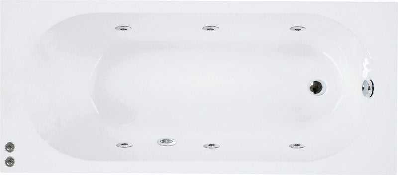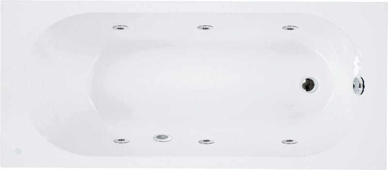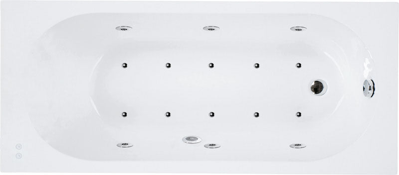 Bomba hidráulica, boquillas hidrodirigibles, bomba de soplador, boquillas de soplador Elegance, pulsador de encendido y apagado de acero inoxidable y retroiluminado, sensor de nivel, sistema "blower" autodrenante, cromoterapia dirigida, tapón.
