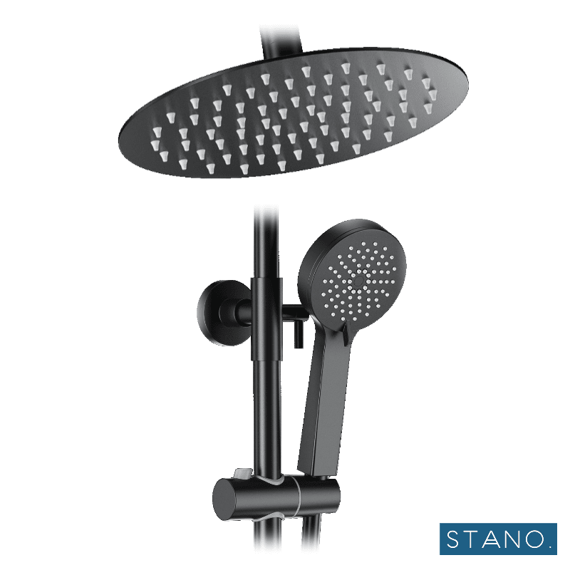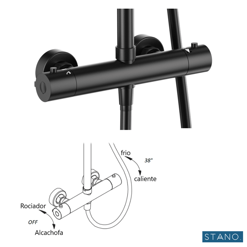 - Fabricación de alta calidad. Grifo termostático en latón macizo y acabado negro mate. Columna de ducha de acero inoxidable. Ducha de mano y cabeza de ducha en ABS y acabado negro mate. Flexible de ducha en PVC