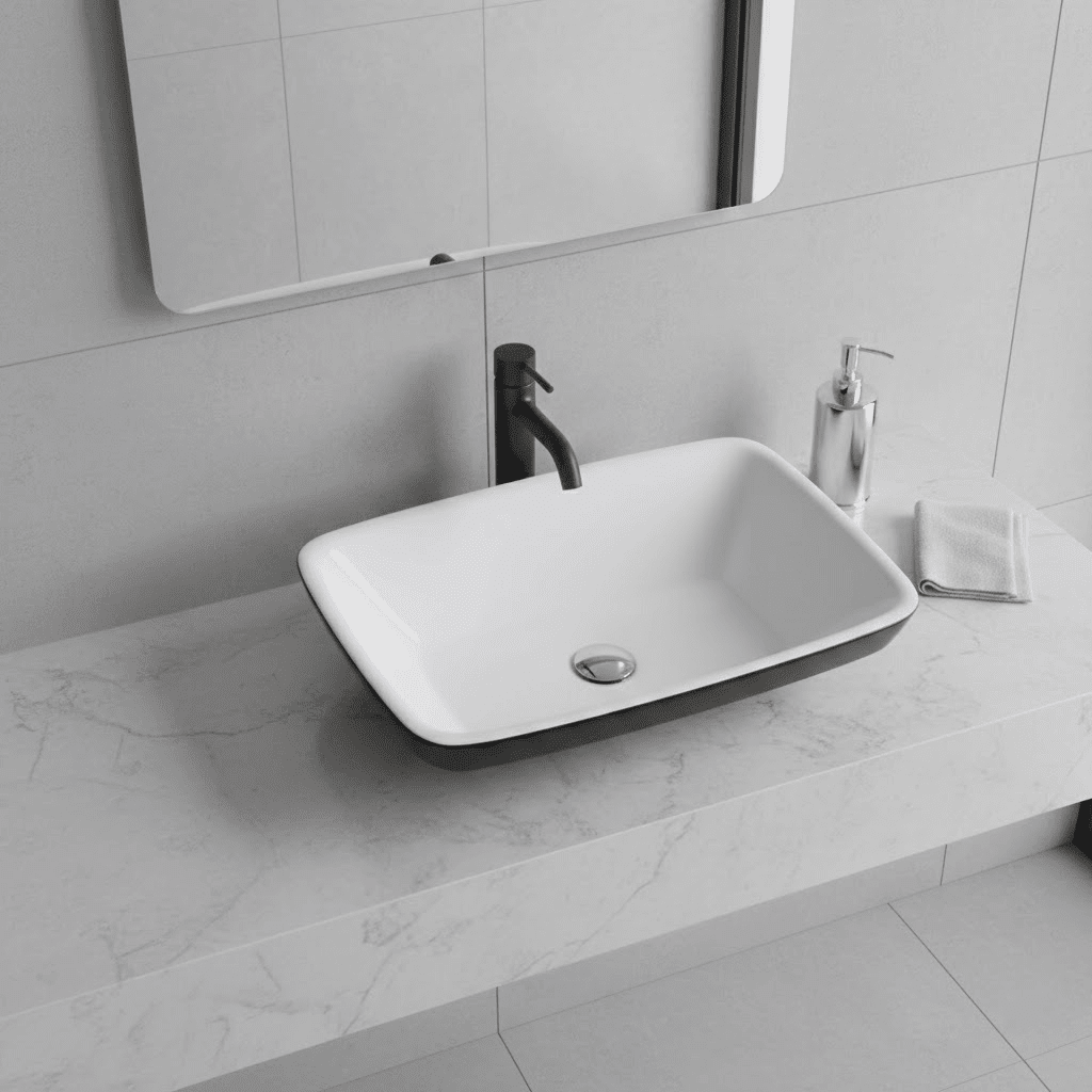 Lavabo sobre encimera STANO de diseño contemporáneo Blanco y Negro de la colección SIENA de mármol cultivado. Este material se define por ser mas resistente que la cerámica, ofrece líneas mas minimalistas y su brillo satinado le da una elegancia notable.