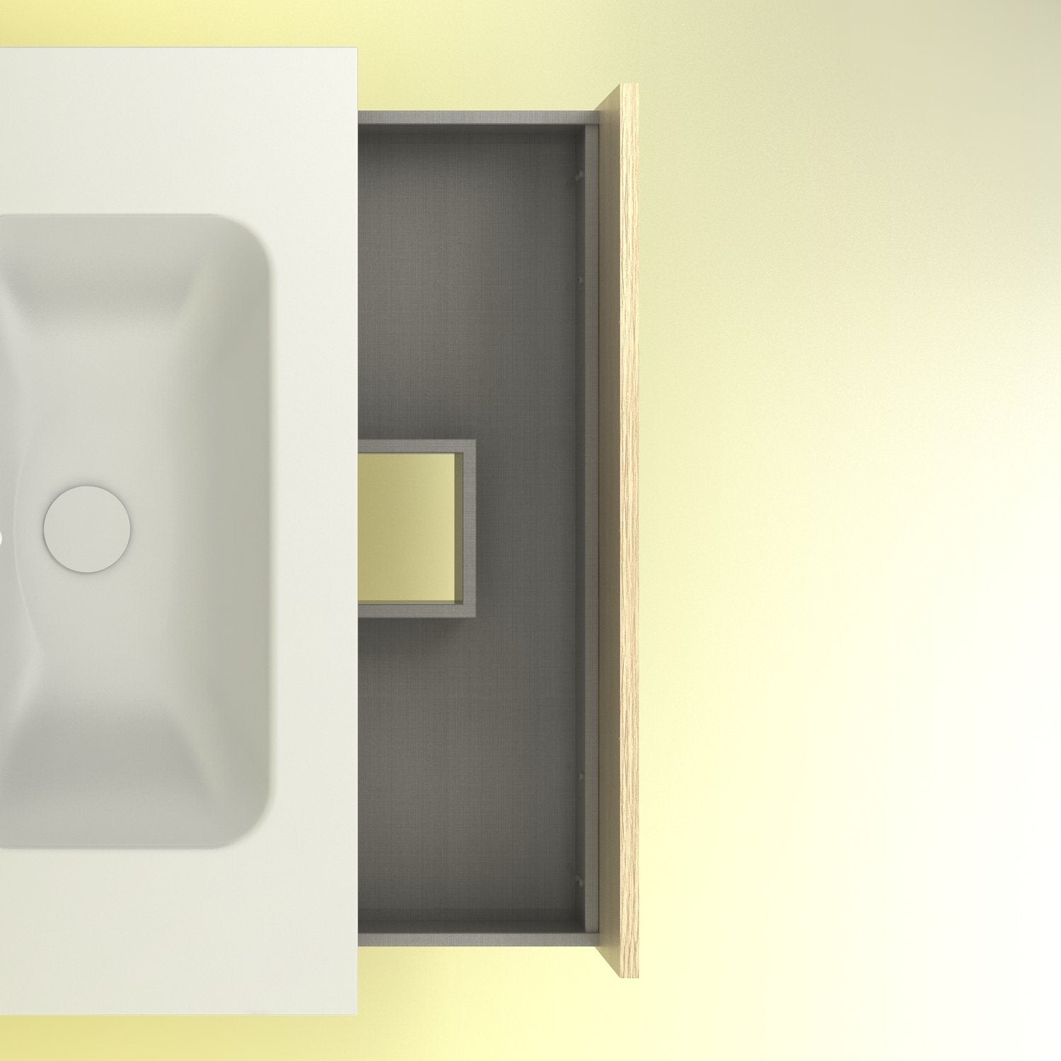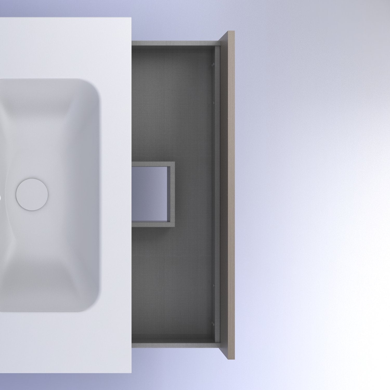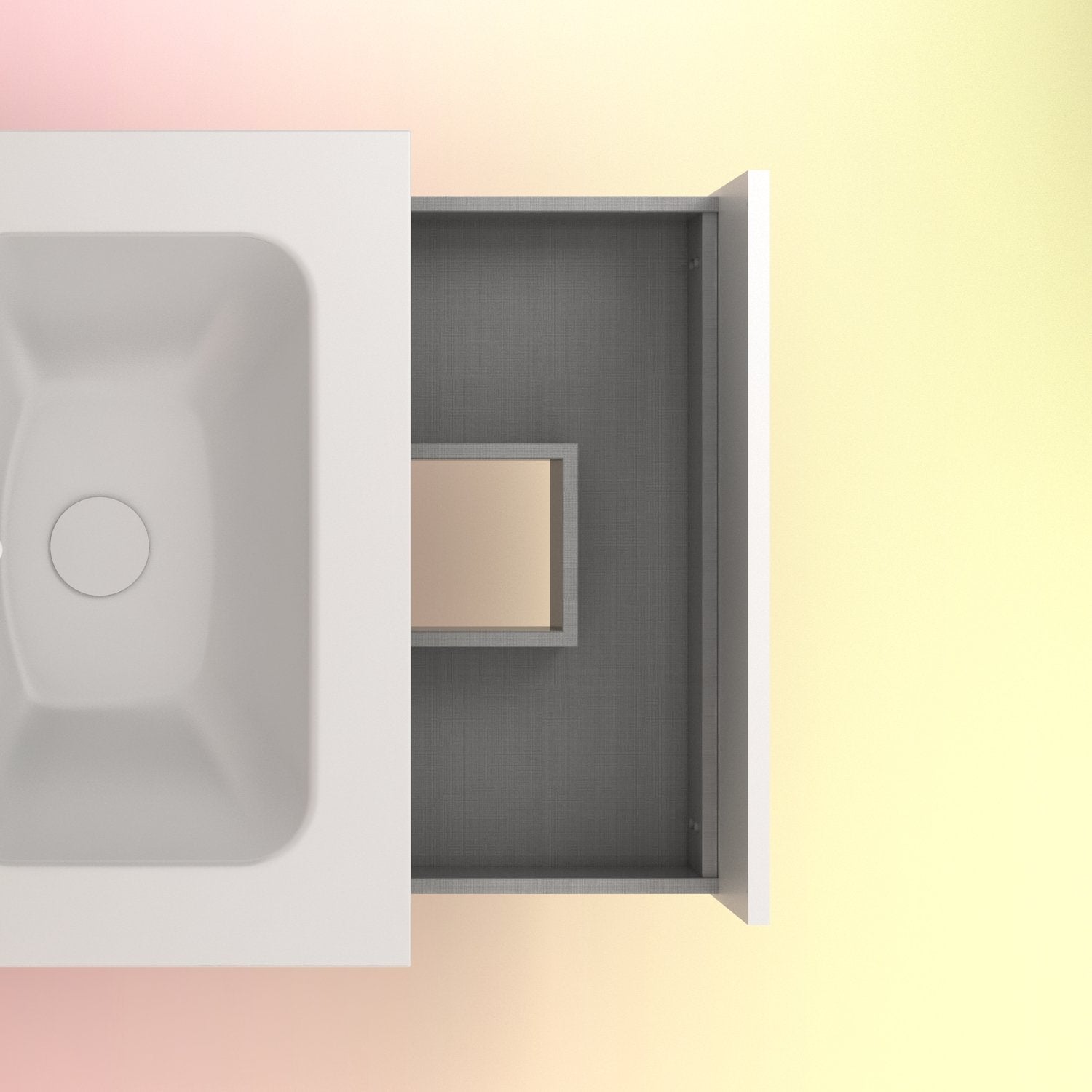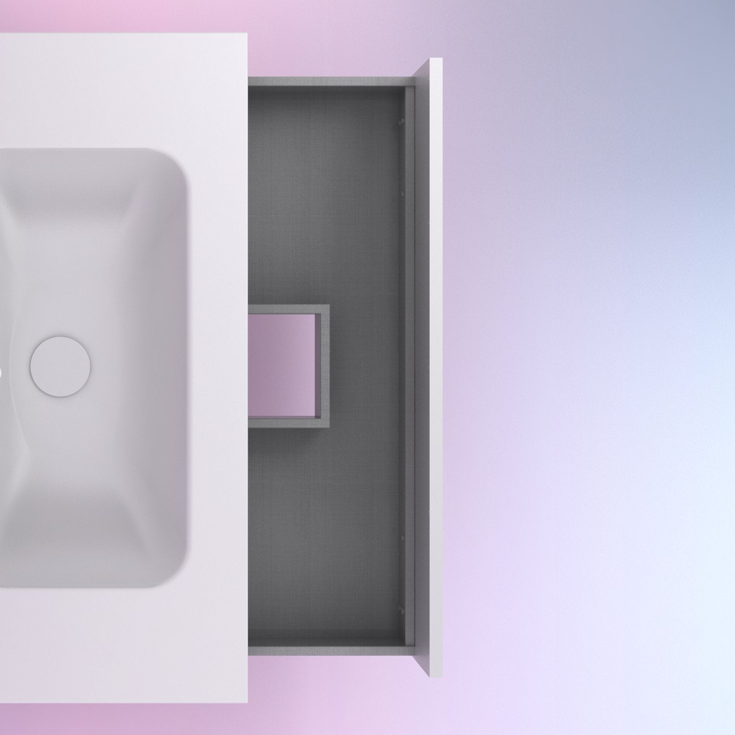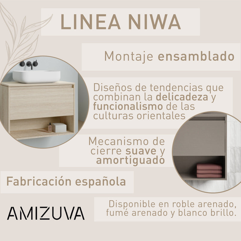 - Fabricación: Realizado en tablero de 16mm lacado blanco alto brillo, el interior de los cajones del mueble NIWA esta realizado en una textura gris textil, las guías incorporan cierre amortiguado y otorgan accesibilidad total al interior del cajón. Tirador integrado