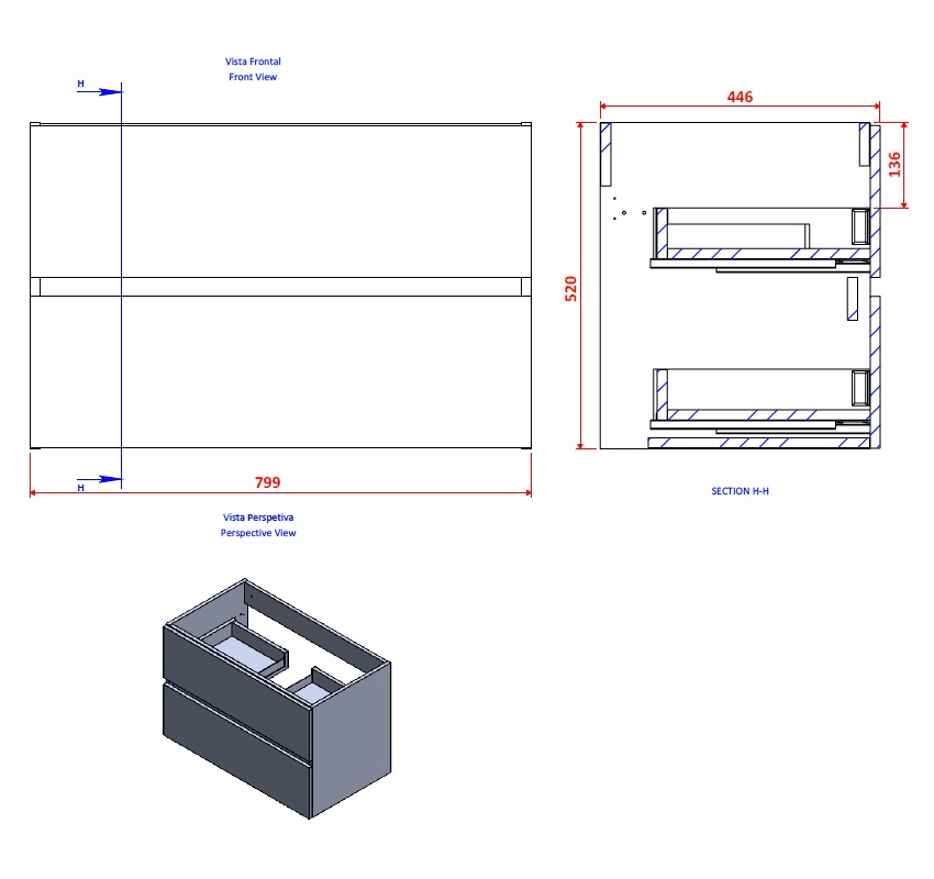 • Dimensiones: 599 x 446 x 520 mm o 799 x 446 x 520 mm