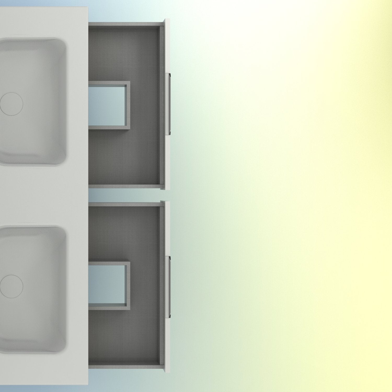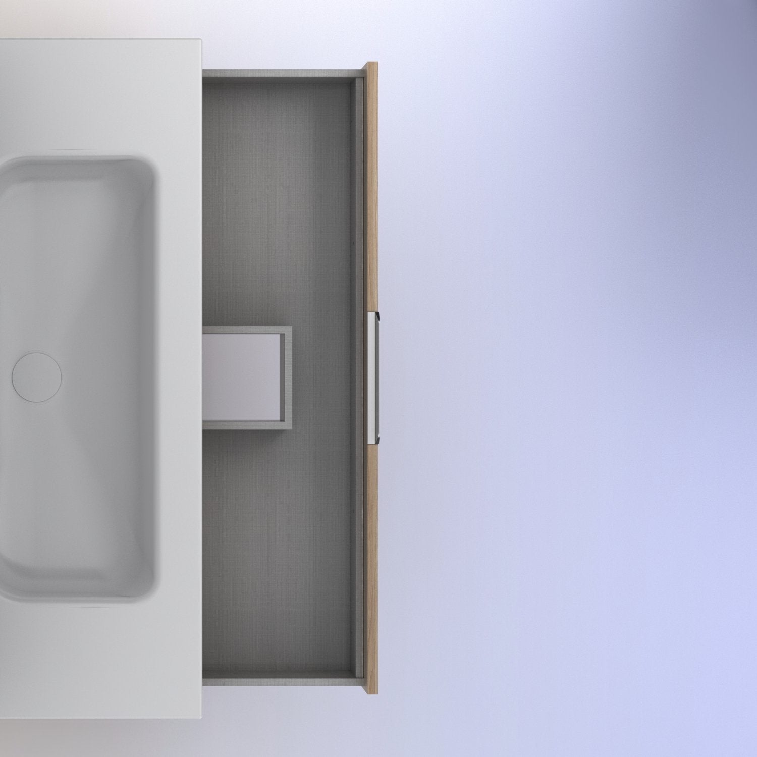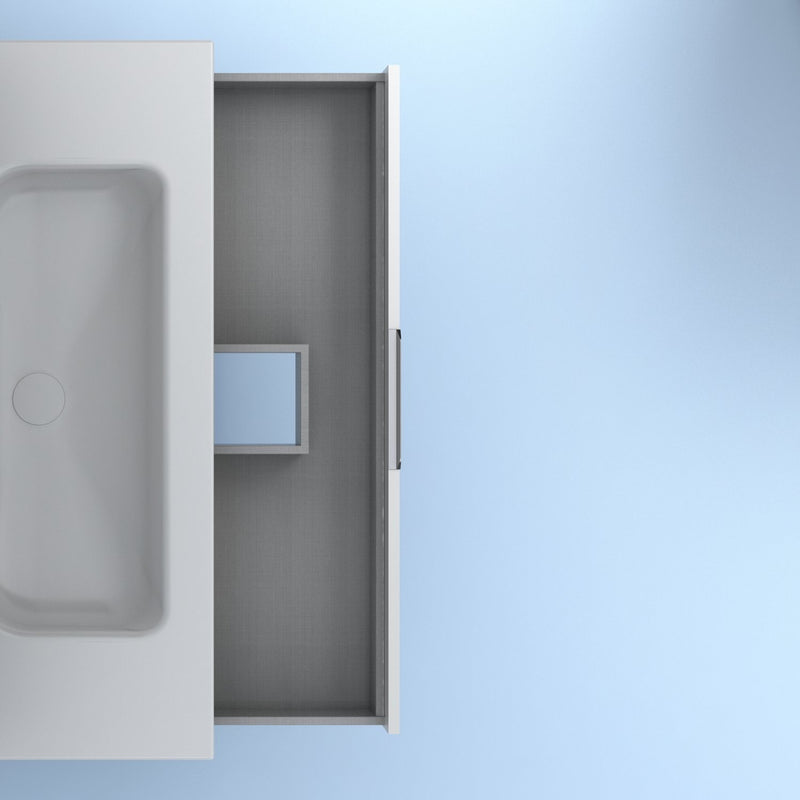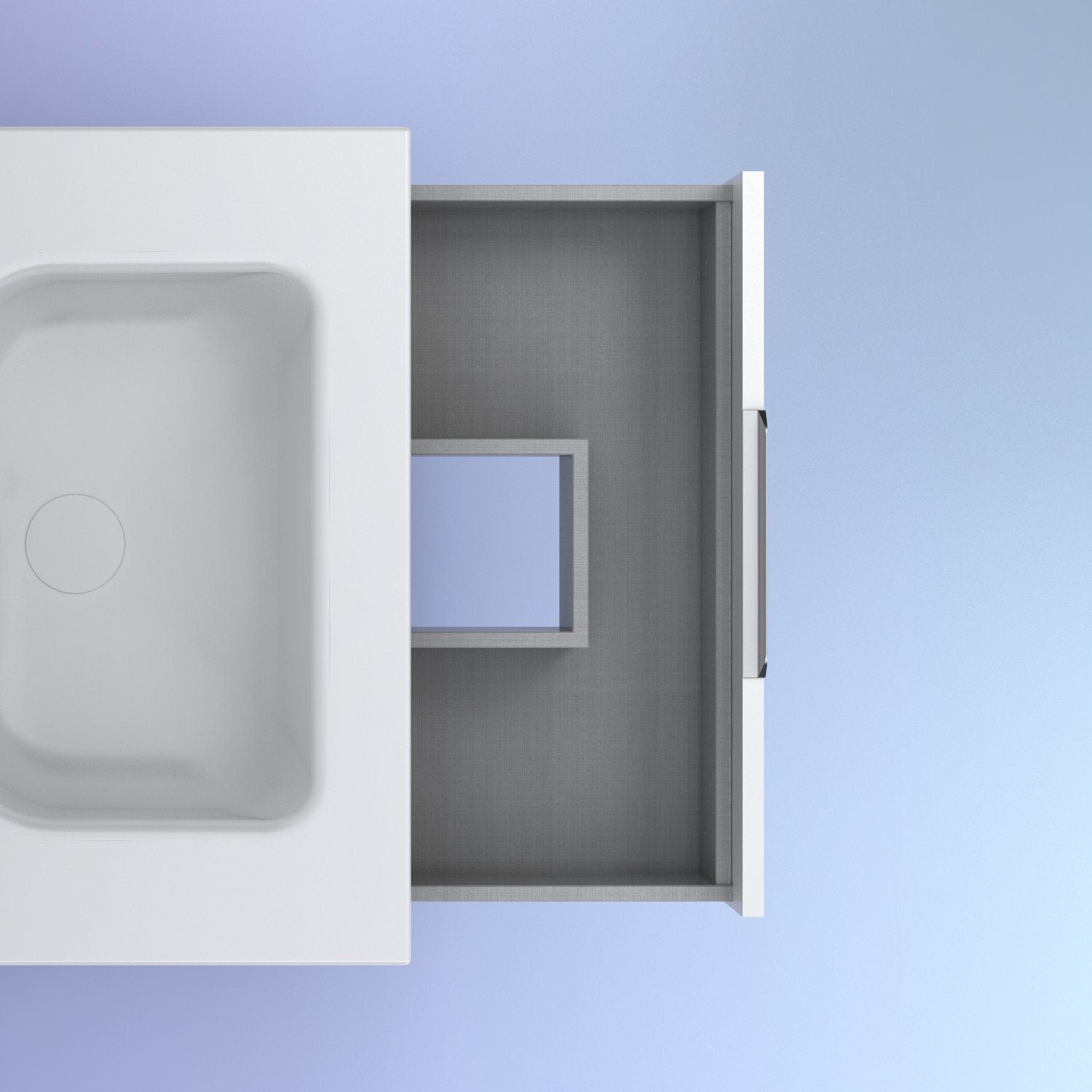 - Fabricación: Este mueble esta realizado en tablero de 16mm lacado alto blanco brillo, el interior de los cajones del mueble SUKI esta realizado en una textura gris textil y las guías incorporan cierre amortiguado y otorgan accesibilidad total al interior del cajón