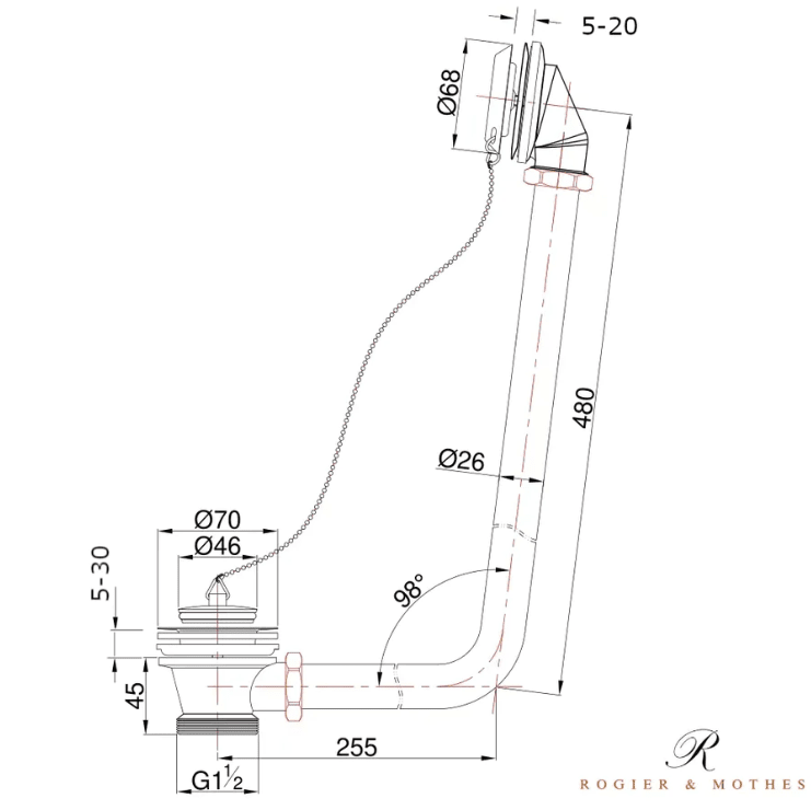 Desagüe con cadenilla Rogier&Mothes en latón macizo acabado cromado para bañeras de hierro fundido modelos BRADFORD y SOUTHPORT.