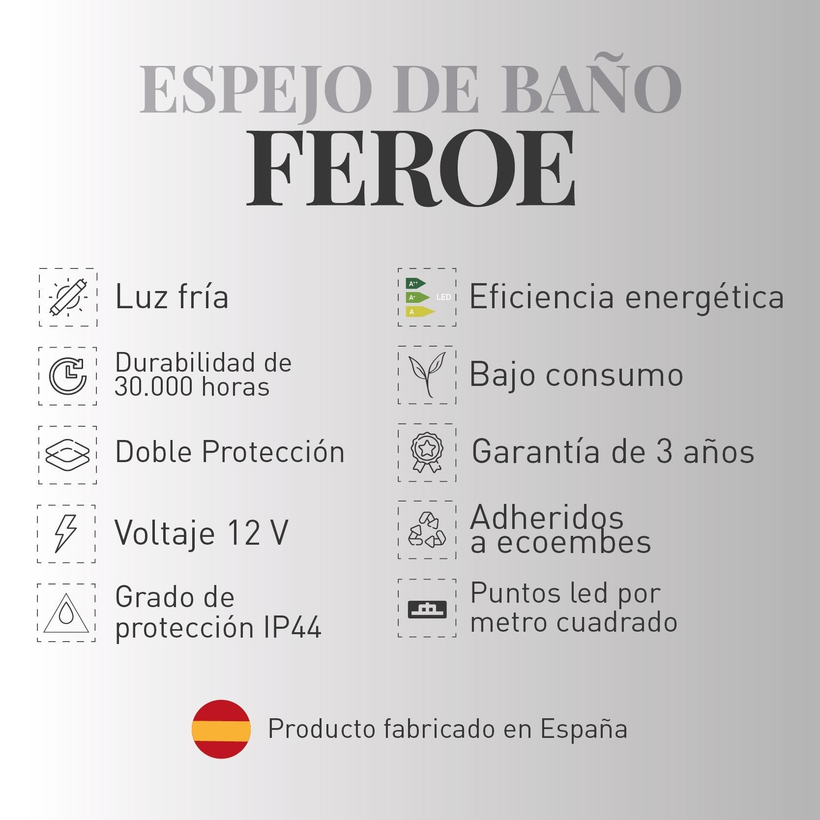 - Doble Protección: Estos espejos están fabricados bajo una norma obligatoria para los productos que se conectan a la red eléctrica y que la normativa de los países de la Unión Europea señala que el cable de conexión tiene que ser con doble protección.