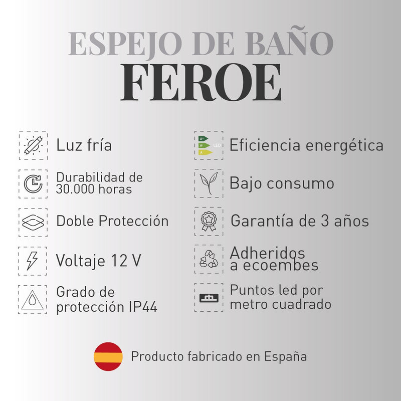 - Grado de protección IP44: Normativa que exigen los países de la Unión Europea señala que la protección mínima tiene que ser que en caso de fuga, rotura de una tubería o gotera en un techo superior tiene que aguantar al menos 44 minutos sin que el agua le pueda entrar a ninguna de las conexiones del espejo y provocar un cortocircuito.