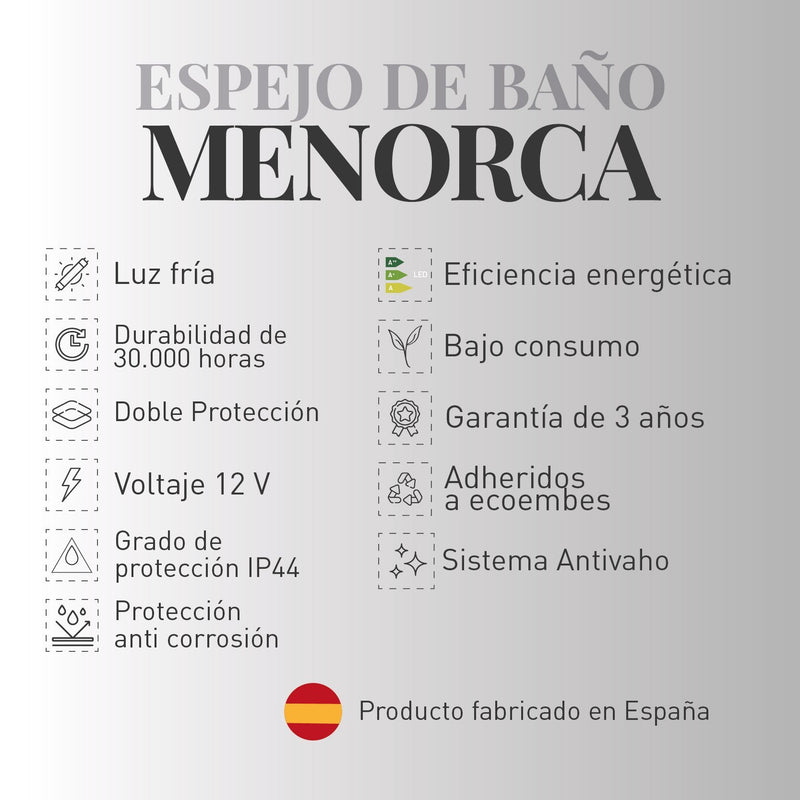 El espejo de baño MENORCA, con luz fría integrada es el elemento perfecto para combinar funcionalidad y diseño.