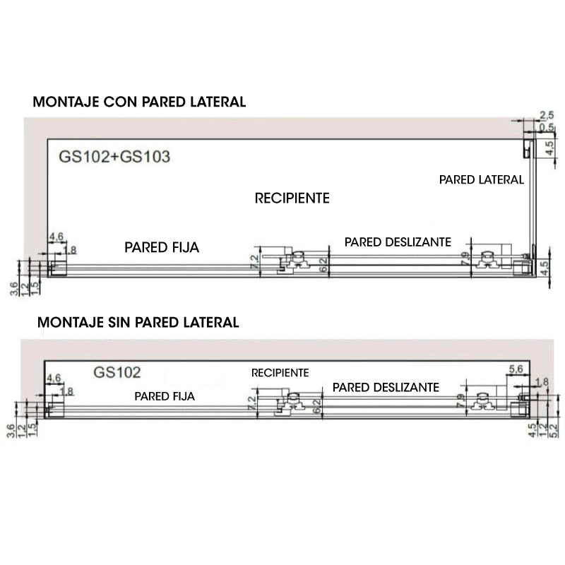 Nota: La longitud total de la pared se puede modificar unos centímetros ajustando el espacio interior del perfil o el cruce de la puerta. El ajuste se realiza durante la instalación y permite absorber las pequeñas variaciones de distancia que pueda tener su instalación una vez instalado el plato de ducha. Te indicamos en esta tabla la talla disponible para cada modelo:
