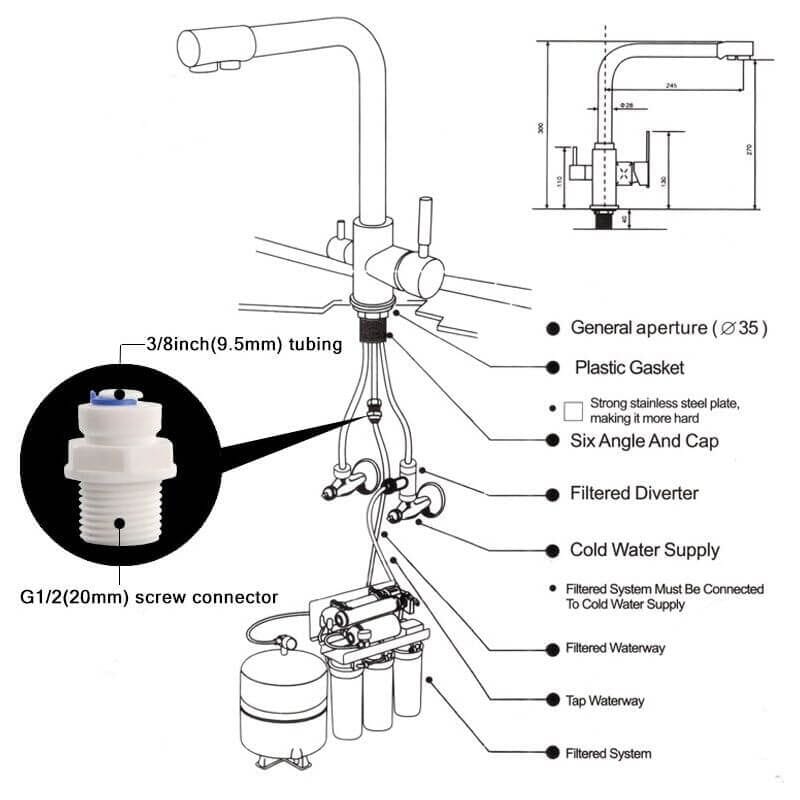 Grifo de cocina con salida de ósmosis integrado con 3 vías, para agua fría, agua caliente y ósmosis.