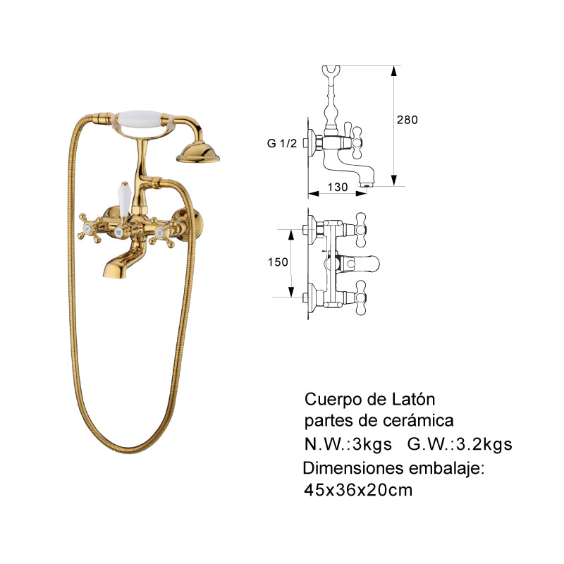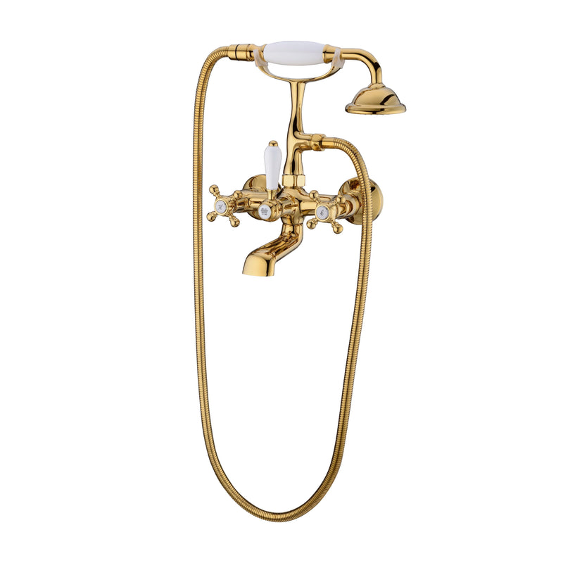 Grifo pared retro baño/ducha KINGDOM dorado con soporte ducha de mano y de pared
