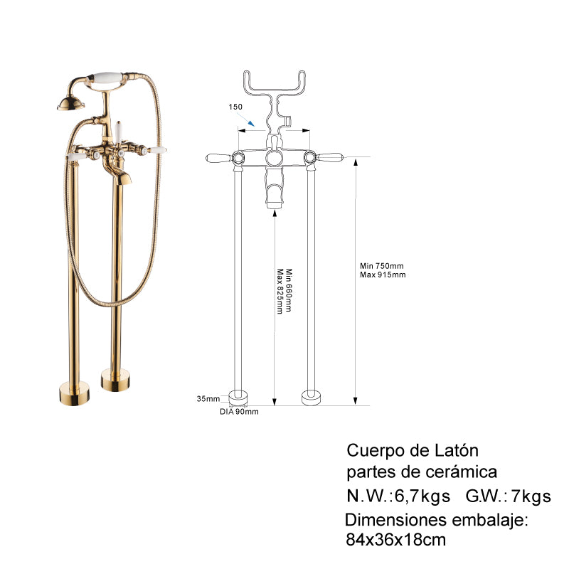 - Fabricación de calidad en latón macizo acabado dorado. Instalación por fijación al suelo para una bañera clásica de hierro fundido o una bañera retro de Resicryl®