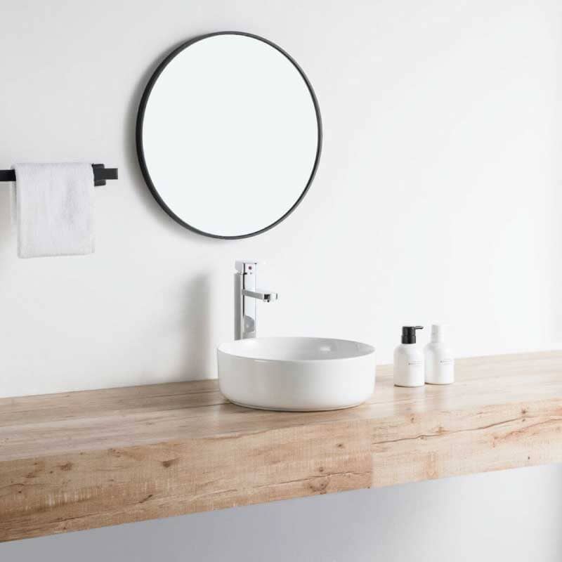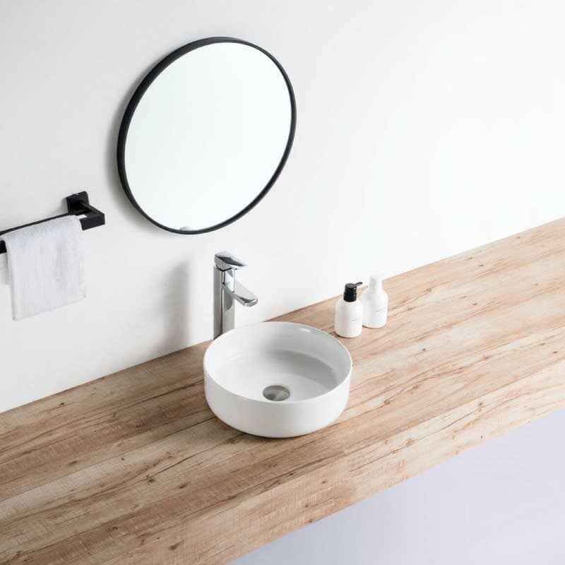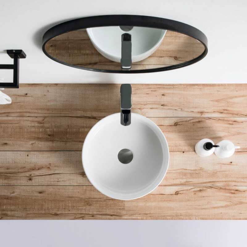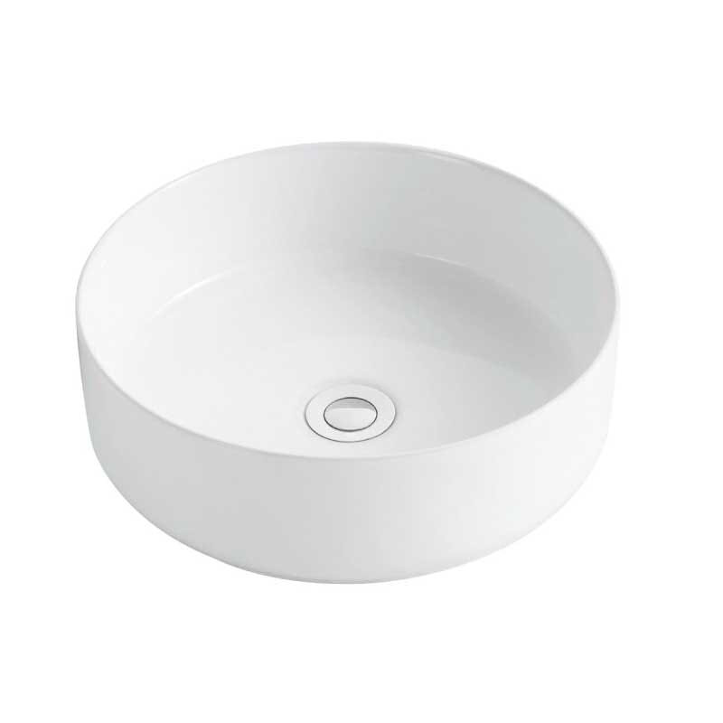 Lavabo redondo de cerámica esmaltada con acabado blanco brillante, aporta un toque contemporáneo a su cuarto de baño.