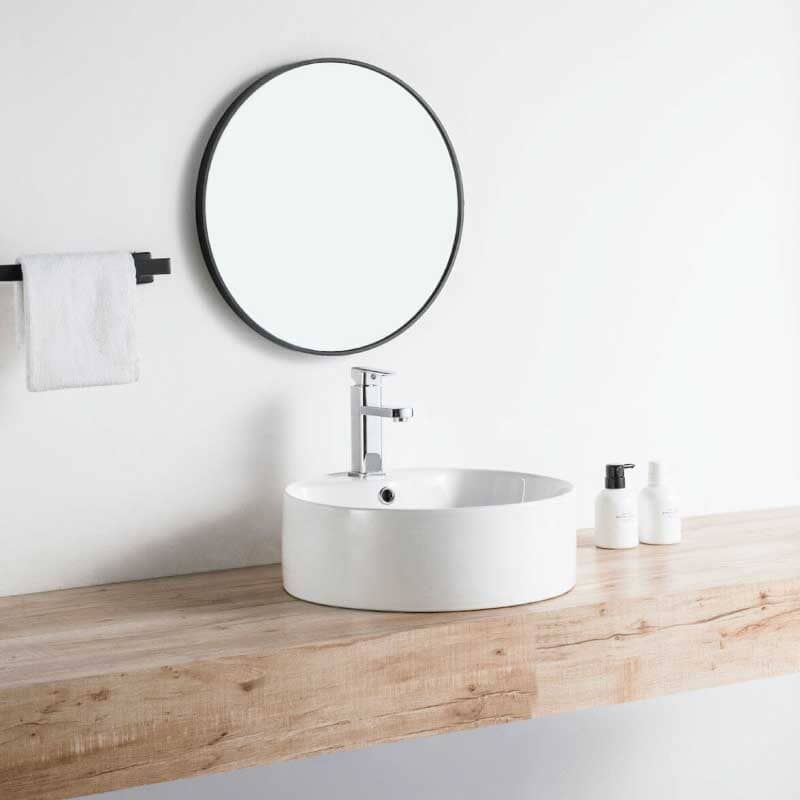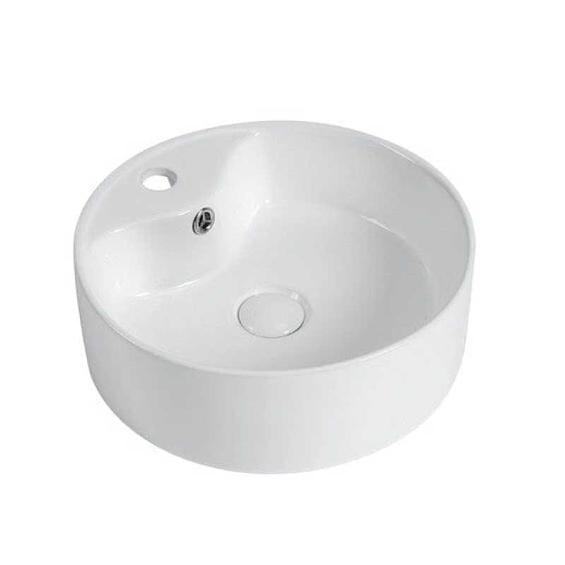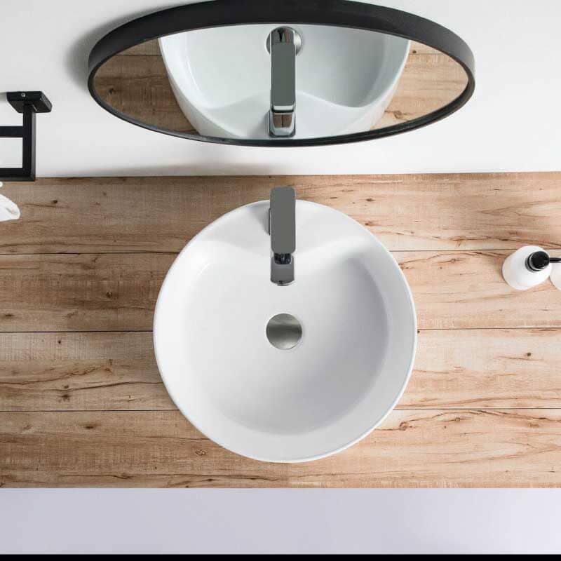 Lavabo redondo sobre encimera, en cerámica vitrificada con acabado blanco brillante, aportando un toque contemporáneo a tu baño.