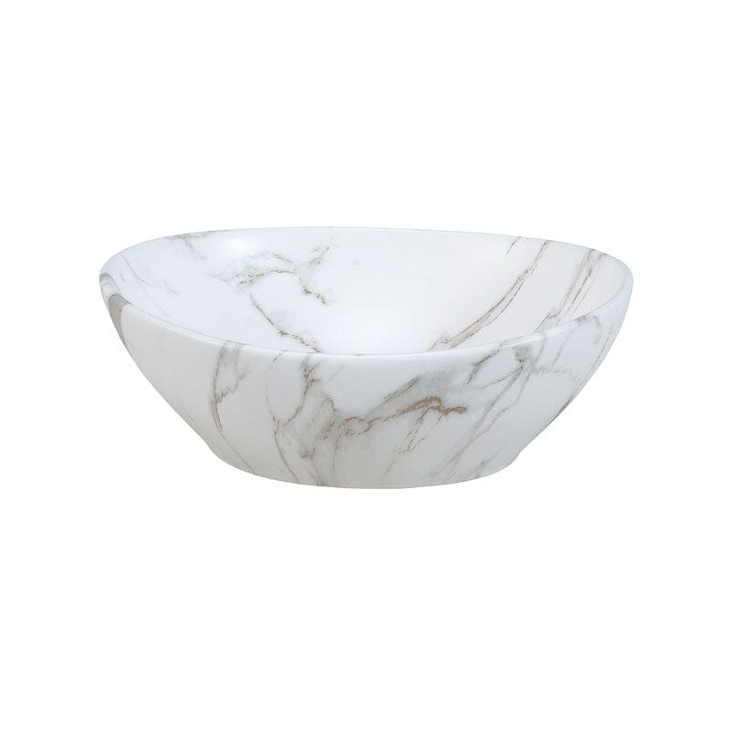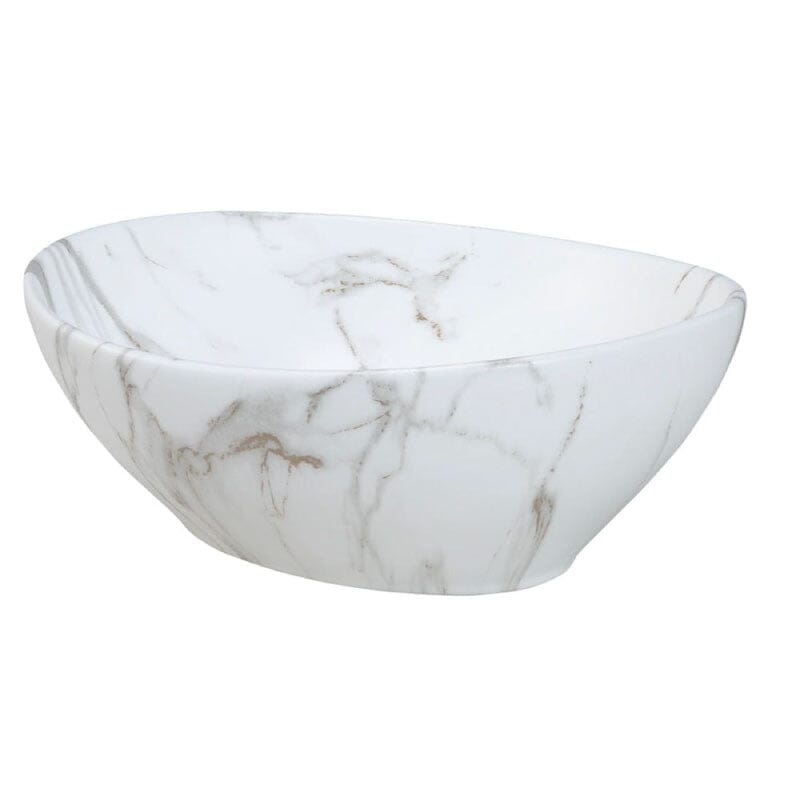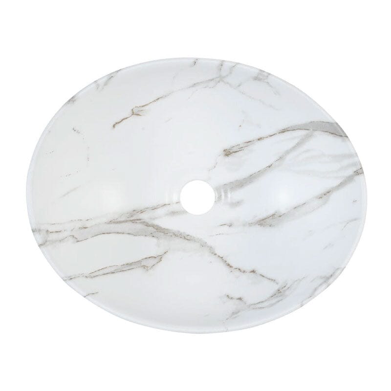 Lavabo ovalado de cerámica en acabado de mármol blanco, dará un toque elegante a su cuarto de baño.