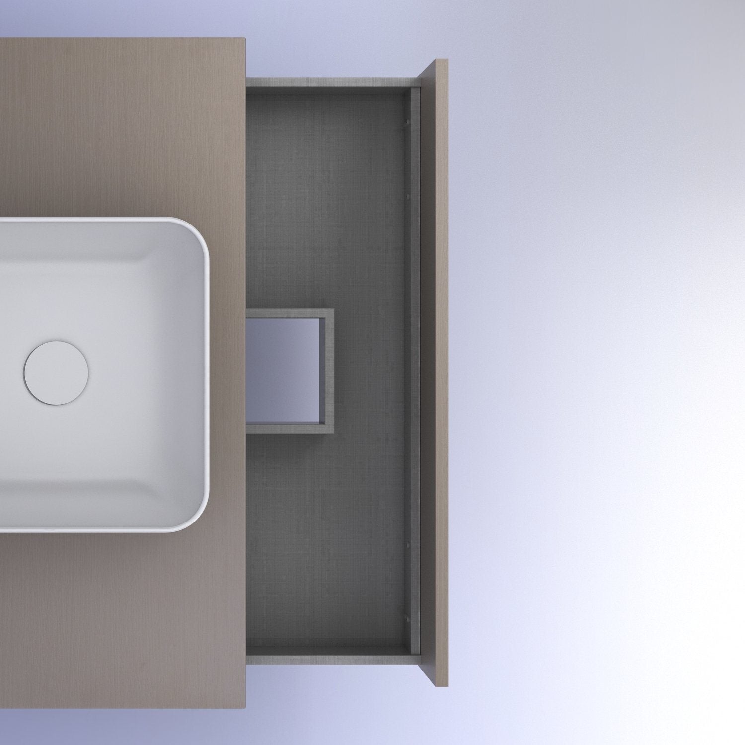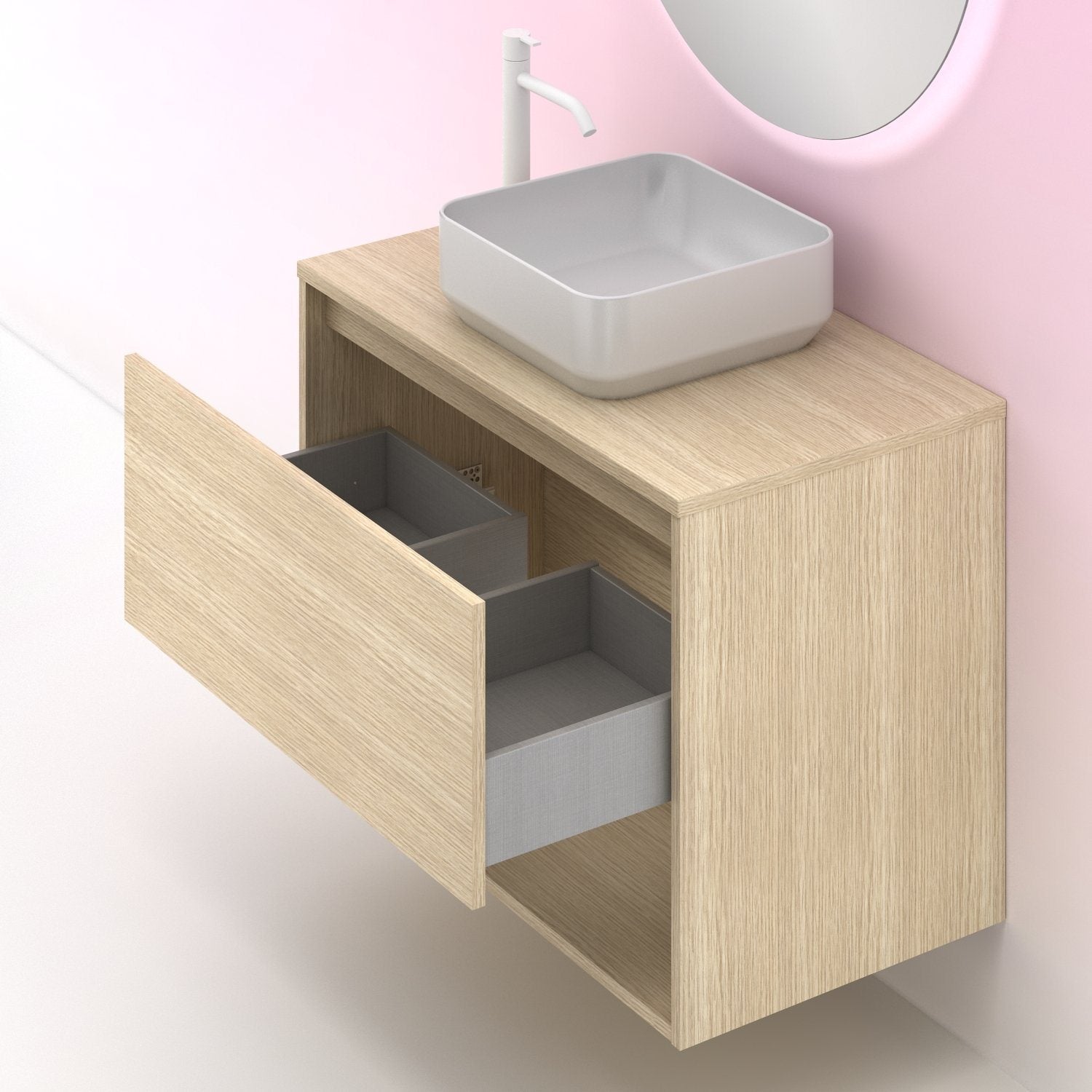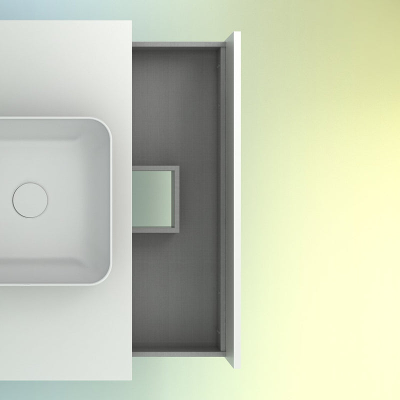 - Fabricación: Construido en un tablero de 16mm lacado blanco alto brillo, el interior de los cajones del mueble NIWA TOP esta realizado en una textura gris textil y las guías incorporan cierre amortiguado y otorgan accesibilidad total al interior del cajón. Tirador integrado