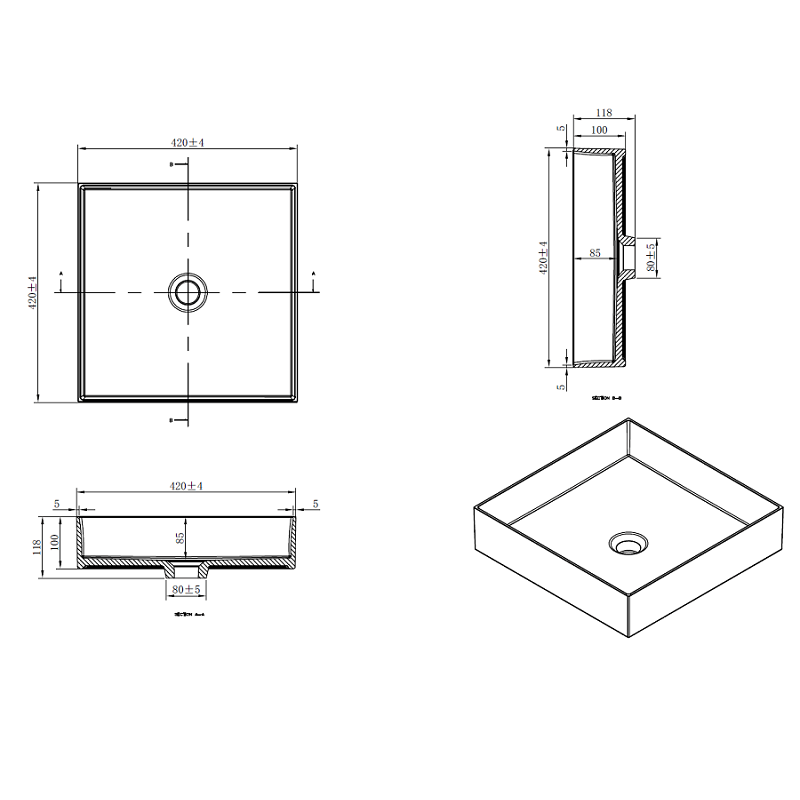 - Medidas: largo 420 mm x ancho 420 mm x altura 118 mm.