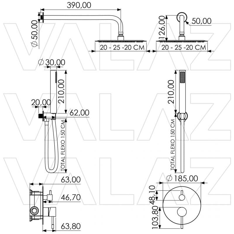 • Materiais: Chuveiro em aço inoxidável, monocomando latão, chuveiro de mão em PVC premium e mangueira de aço inoxidável.
