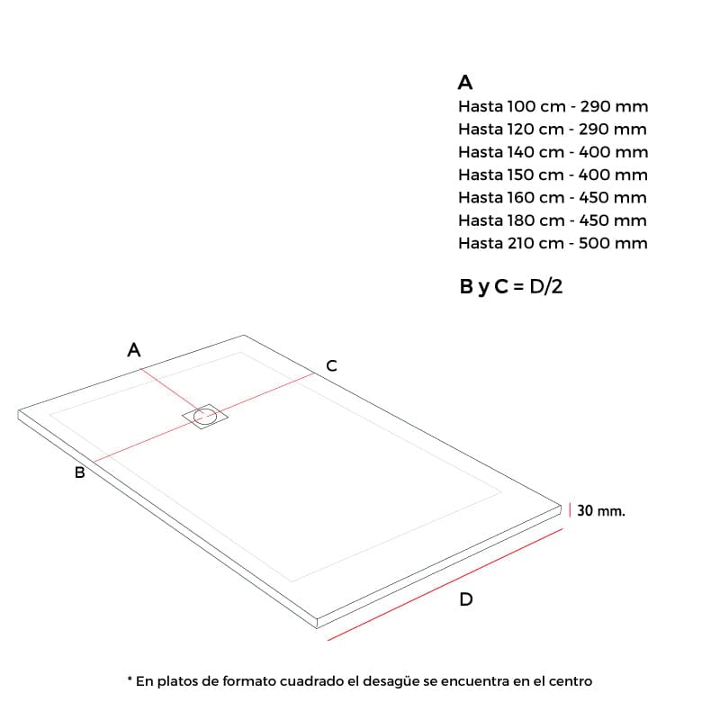 • Há uma zona de 5 cm. em volta de onde não há queda, para poder instalar uma divisória de chuveiro sem problemas de ajuste.