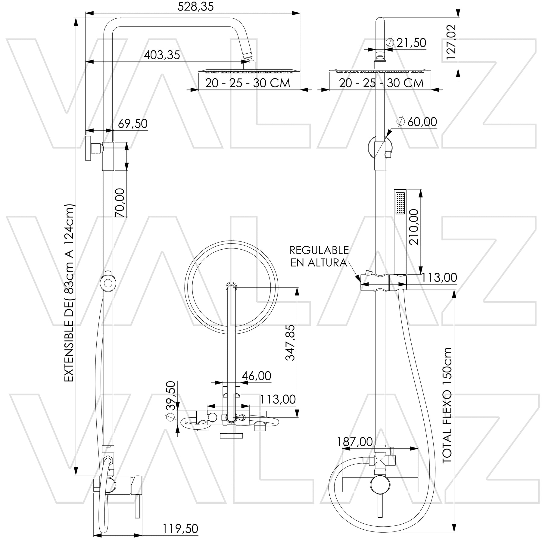 - Coluna de duche com cabeça de chuveiro de grande formato com opções: Ø 20 cm / Ø 25 cm / Ø 30 cm