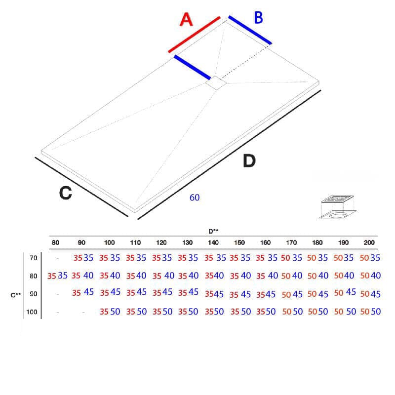 Para bases de duche com 120 cm de comprimento ou largura, aplica-se o seguinte: